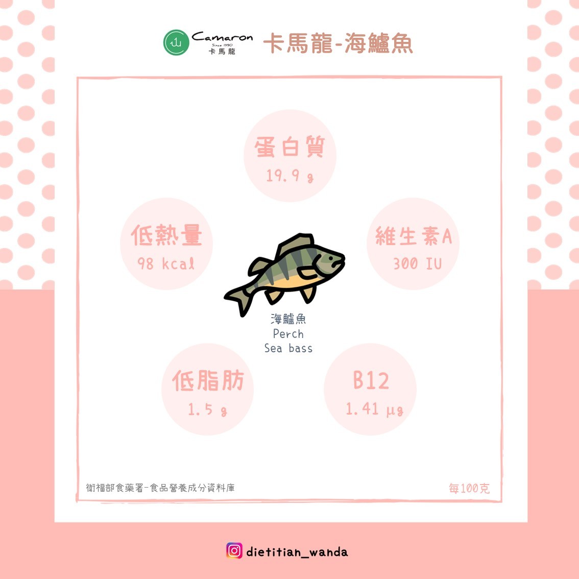 100公克含有19.9克蛋白質,約3份豆魚蛋肉類,以卡馬龍的鱸魚一片約200克,可以分兩餐食用,像營養師本人分享的便當裡就是半片鱸魚唷~一餐蛋白質就簡單get😋