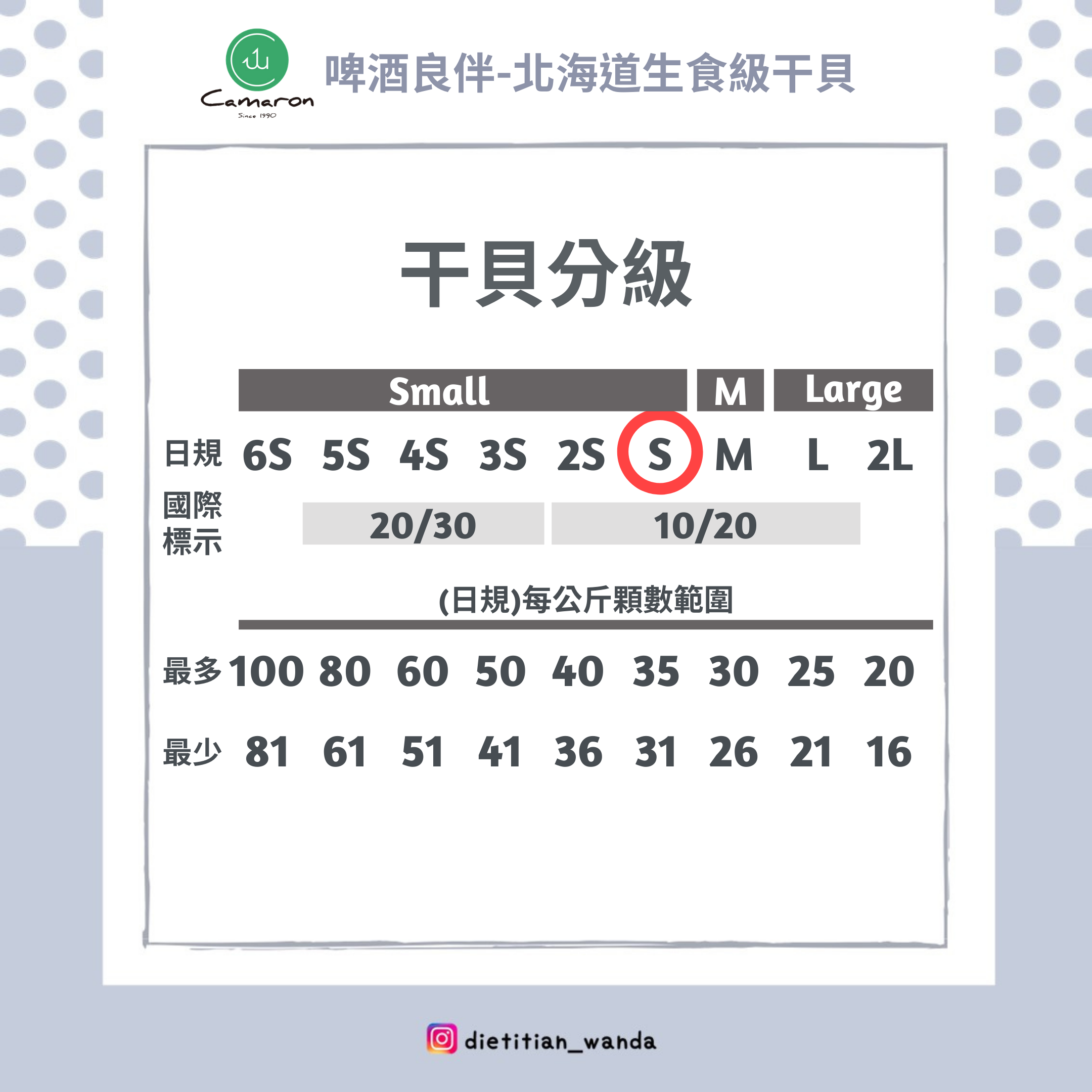 以日規來說分為9個等級,分別為S-6S、M、L,等級依每公斤顆數來劃分以卡馬龍所販售的生食級干貝 S 來說,每公斤至少要31顆,最多35顆,以此類推。((每公斤顆數越多,每顆干貝越小))