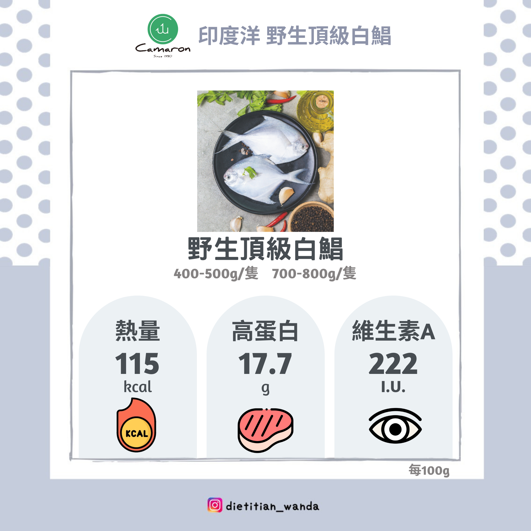 100克的白鯧,熱量115大卡,約有18克蛋白質,4.4克脂肪,相當於2.5份的豆魚蛋肉類~