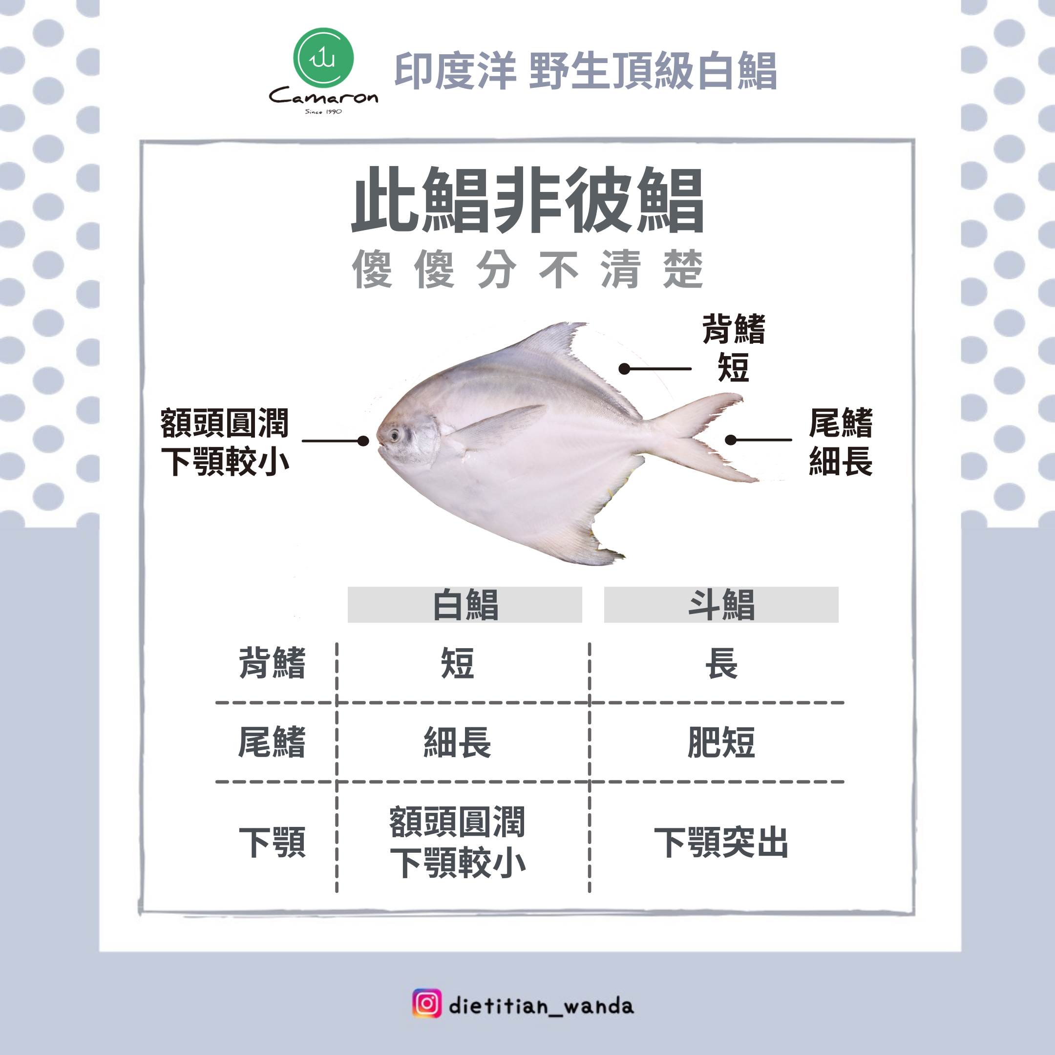 - 白鯧:下顎較短,頭圓圓的