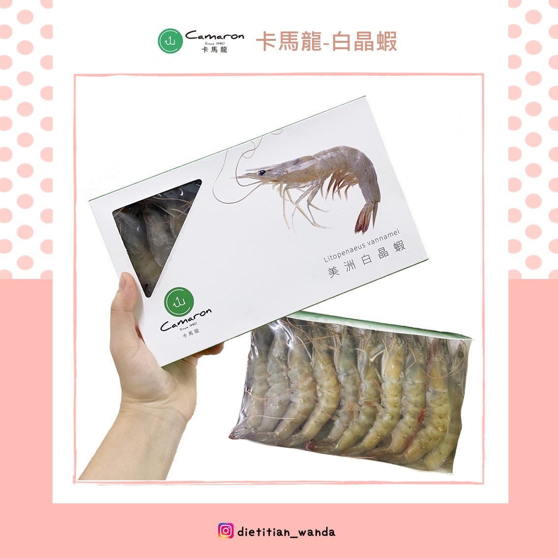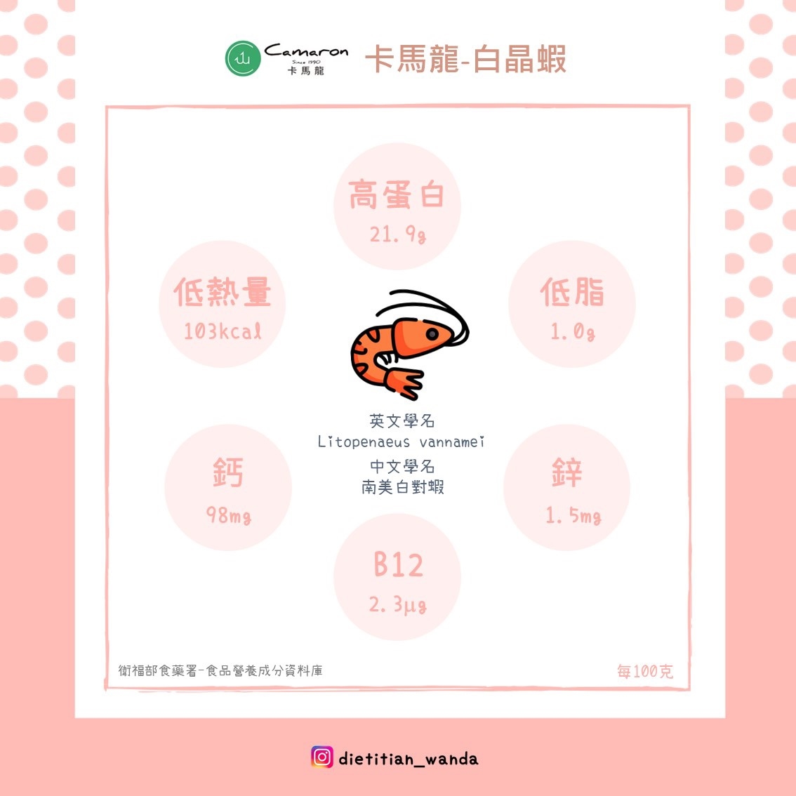 100公克只有103大卡,以Camaron卡馬龍白晶蝦來說,生重連殼約30克,熟重一隻去殼後約15克,這樣一隻才約15大卡呢!